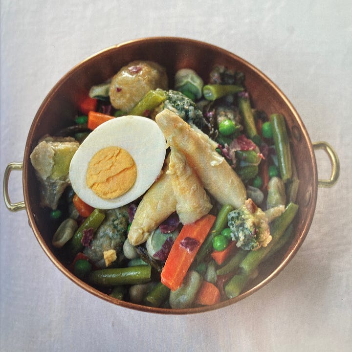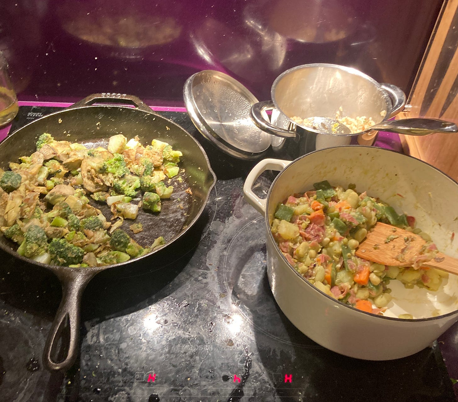 When the artichokes and broccoli are done, you put them into the pot to fraternize with the ham and veggies that are already there. Also, drain and add in the asparagus from the jar that you pre-bought because you’re smart like that.