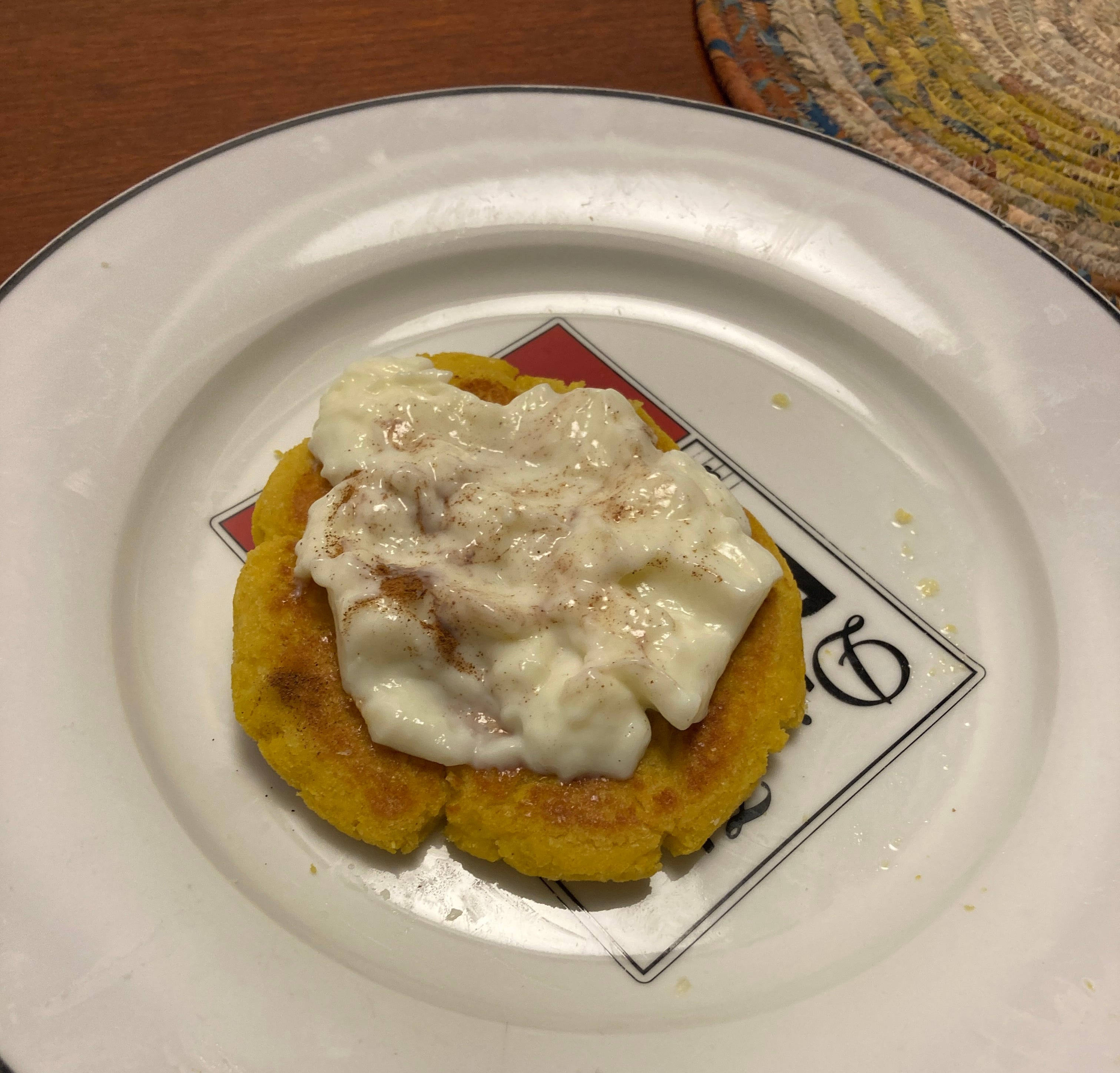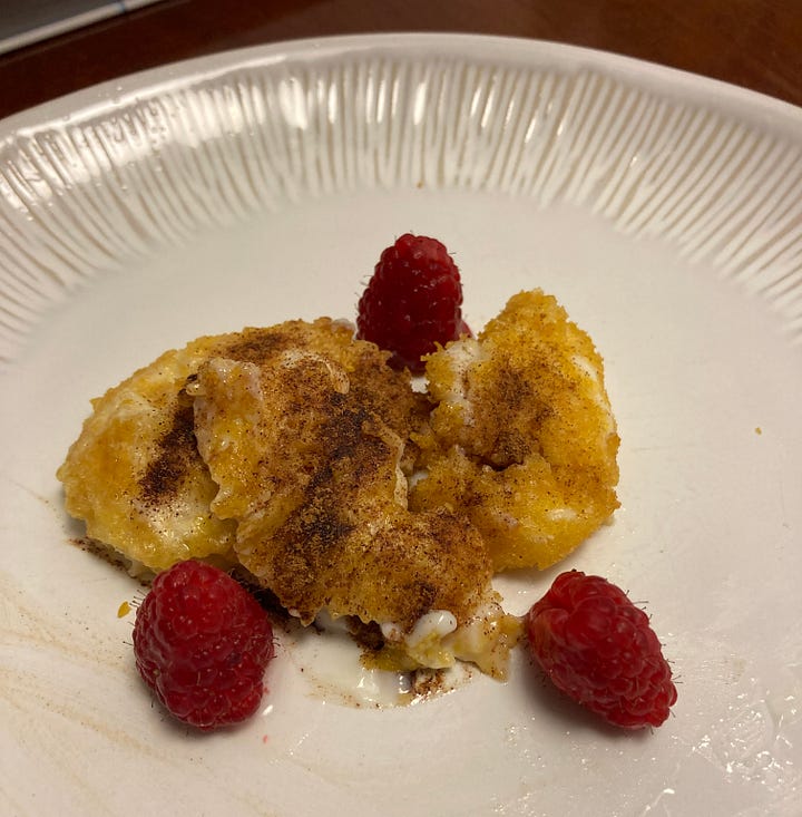 The Leche Frita (fried milk) was fabulous. I did it almost all wrong, but it was still delicious. You’re supposed to create an almost jello-like consistency with the milk mixture, but mine was way too liquidy. This resulted in a truly disastrous frying experience. You’re supposed to end up with cubes that you coat in flour and egg, then fry. I basically just had spoonfuls of sweet goop that I tried to coat in breadcrumbs (this recipe called for them, but I am going to switch to flour next time) and egg, but the egg caused my goop to goopify even further. Then when I put it in the frying oil it splattered to high heaven and also stuck to the bottom for some reason. My friend has advised me to use more oil next time - which I will. The lack of structural integrity made it very difficult to rotate and resulted in me corralling a spreading mass into something resembling solid food and scooping it out onto the paper towel.